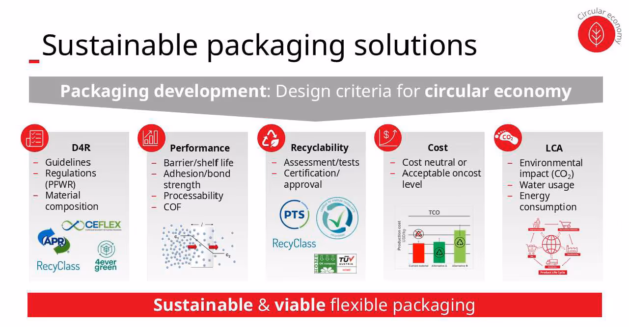 Chi phí là trọng tâm của trụ cột thứ tư và xem xét liệu tổng chi phí của vật liệu có mức giá phù hợp, nghĩa là nó phải có mức giá trung lập chi phí hoặc mức chi phí phụ hợp lý. Trụ cột cuối cùng là Đánh Giá Vòng Đời - Life Cycle Assessment (LCA), đánh giá xem liệu vật liệu phát triển có thân thiện với môi trường hơn các lựa chọn hiện tại hay không. Đánh giá Vòng Đời (LCA) xem xét các hạng mục như dấu chân carbon (carbon footprint), mức sử dụng nước và tiêu thụ năng lượng để đánh giá tác động môi trường của vật liệu bao bì.